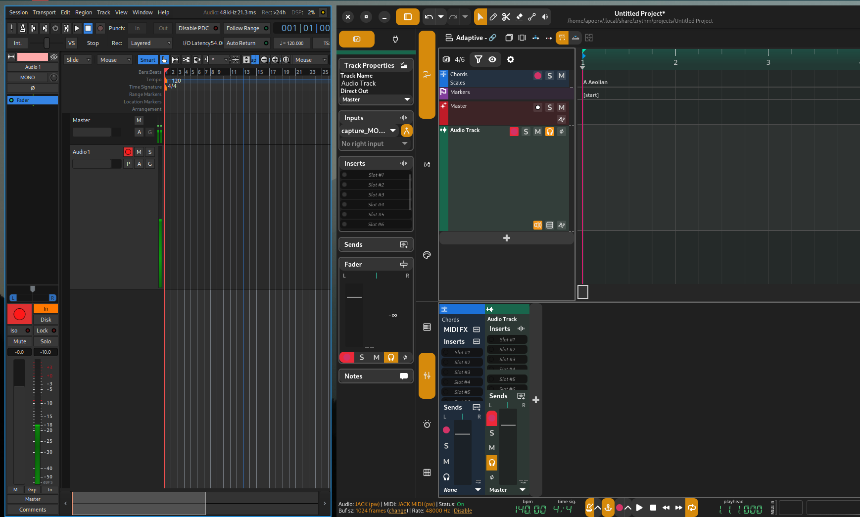 Here is Ardour and Zrythm side-by-side using same input. You can see Ardour has input signal flowing while Zrythm doesn’t.